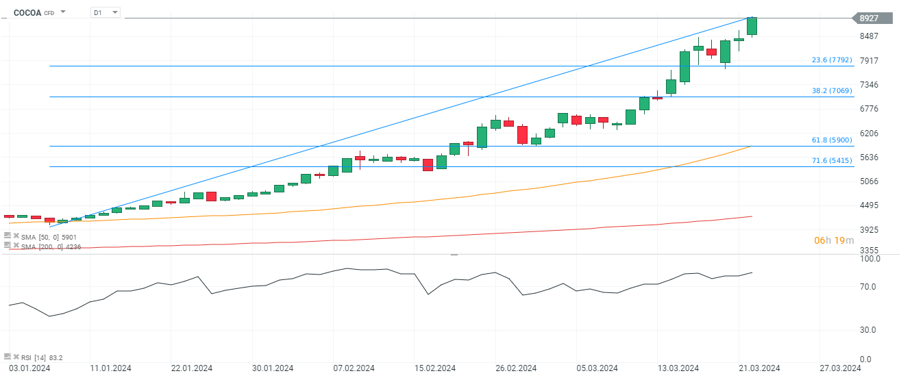 Kakao zyskuje w dniu dzisiejszym 6,01%, tym samym osiągając nowe rekordowe poziomy. W momencie publikacji za tonę kakao prawie 9000 USD, a perspektywy na najbliższe miesiące nie są pocieszające. Wzrost ma miejsce na tydzień przed świętami, gdy sezonowo popyt na kakao jest bardzo wysoki.