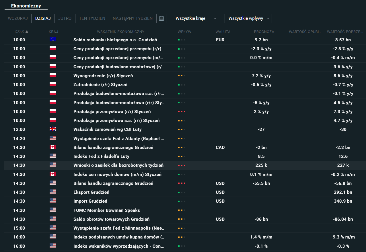 Dzisiejszy kalendarz makroekonomiczny jest stosunkowo lekki. Kluczowym odczytem będzie grudniowy bilans handlu zagranicznego USA. W kontekście deklarowanego przez Trumpa celu ograniczenia deficytu, dane te są istotne zarówno pod kątem trendu, jak i wpływu wprowadzonych ceł. Konsensus zakłada deficyt na poziomie -55,5 mld USD wobec -56,8 mld USD w listopadzie.
