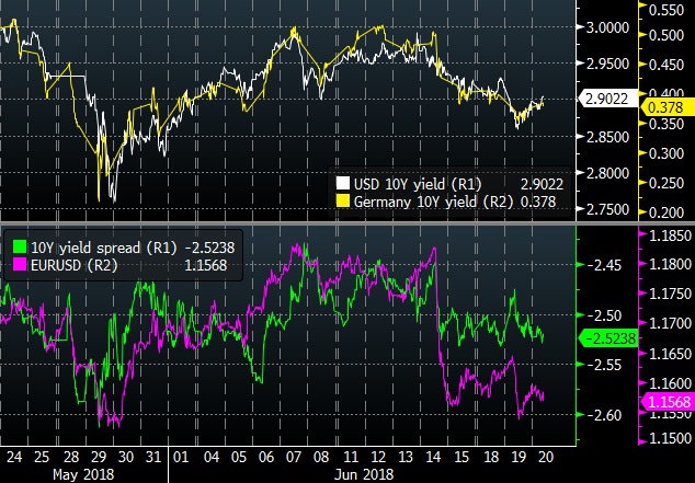 Wydarzeniem numer jeden jest dziś konferencja poświęcona polityce pieniężnej w Portugalii. Wystąpienia trwają praktycznie cały dzień, ale kluczowy będzie panel z udziałem szefów Fed i EBC. Przypomnijmy, że w ubiegłym tygodniu EURUSD zanurkował po tym jak EBC zakomunikował brak podwyżki przynajmniej do września 2019. Ruch był większy niż wynikałoby ze zmian rentowności obligacji, ale czy dziś para dostanie impuls do skorygowania go?