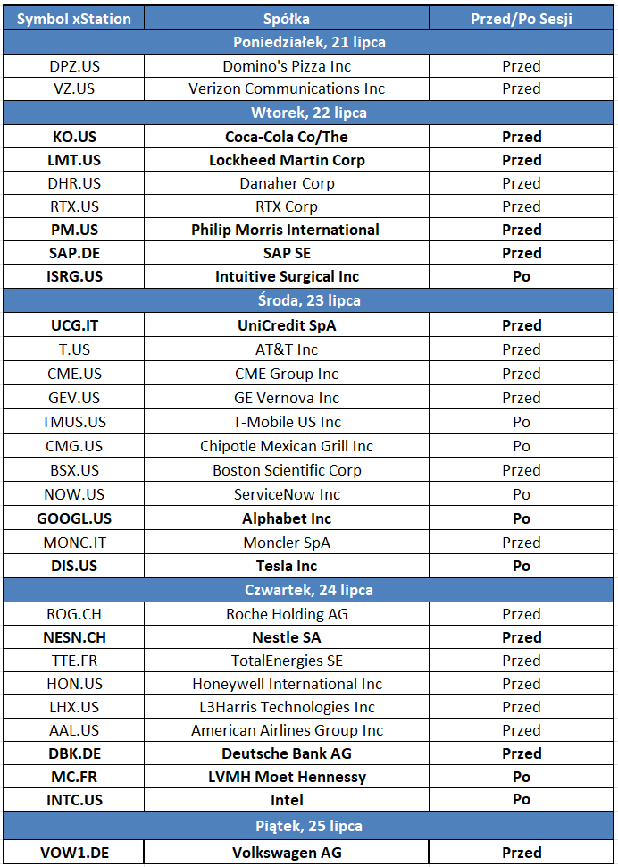 Z kolei jeszcze przed sesją raporty kwartalne opublikowane zostaną m.in. przez Coca-Colę, Lockheed Martin, Philip Morris oraz SAP. Po sesji poznamy wyniki Intuitive Surgical.