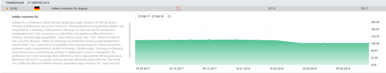 Poniedziałkowy kalendarz w dość lekki sposób rozpoczyna ostatni tydzień sierpnia. Główna pozycja to indeks Ifo (godzina 10:00), gdzie oczekiwany jest lekki wzrost (ze 101,7 do 101,9 pkt.). Nie będzie to jednak bardzo istotna zmiana – po mocnym spadku na początku roku nastroje w Niemczech nie są w stanie istotnie odbić i patrząc na indeksy PMI raczej nie należy spodziewać się większej niespodzianki. Tym niemniej dobry odczyt byłby mile widziany przez DE30, ponieważ sytuacji rynkowej sprzyjają rekordy na Wall Street i mocne wzrosty w Chinach.