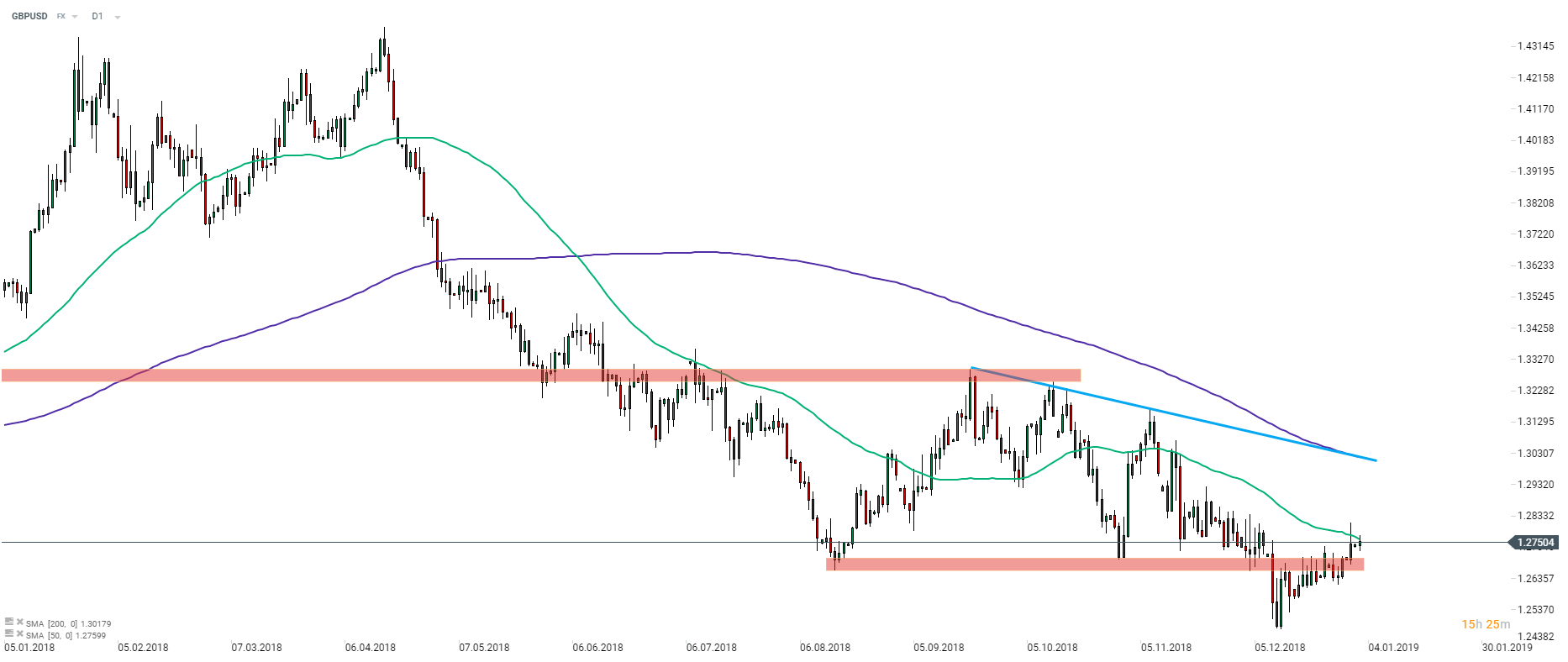 GBPUSD odbił nieznacznie z okolic najniższych poziomów od kwietnia 2017 roku. Para przebiła się przez strefę oporu przy 1,2650-1,2700, ale reaguje negatywnie na średnią 50 kresową. Nieznacznie wyżej znajduje się linia trendu spadkowego. Źródło: xStation5