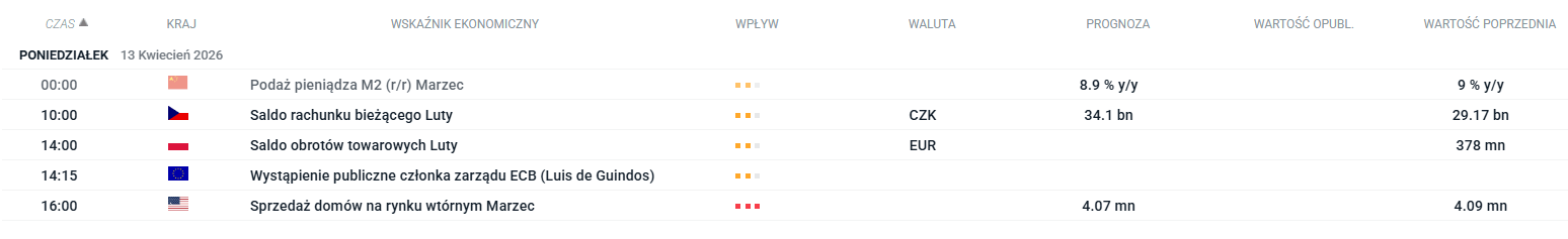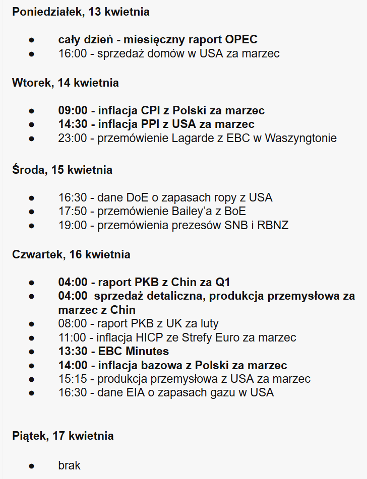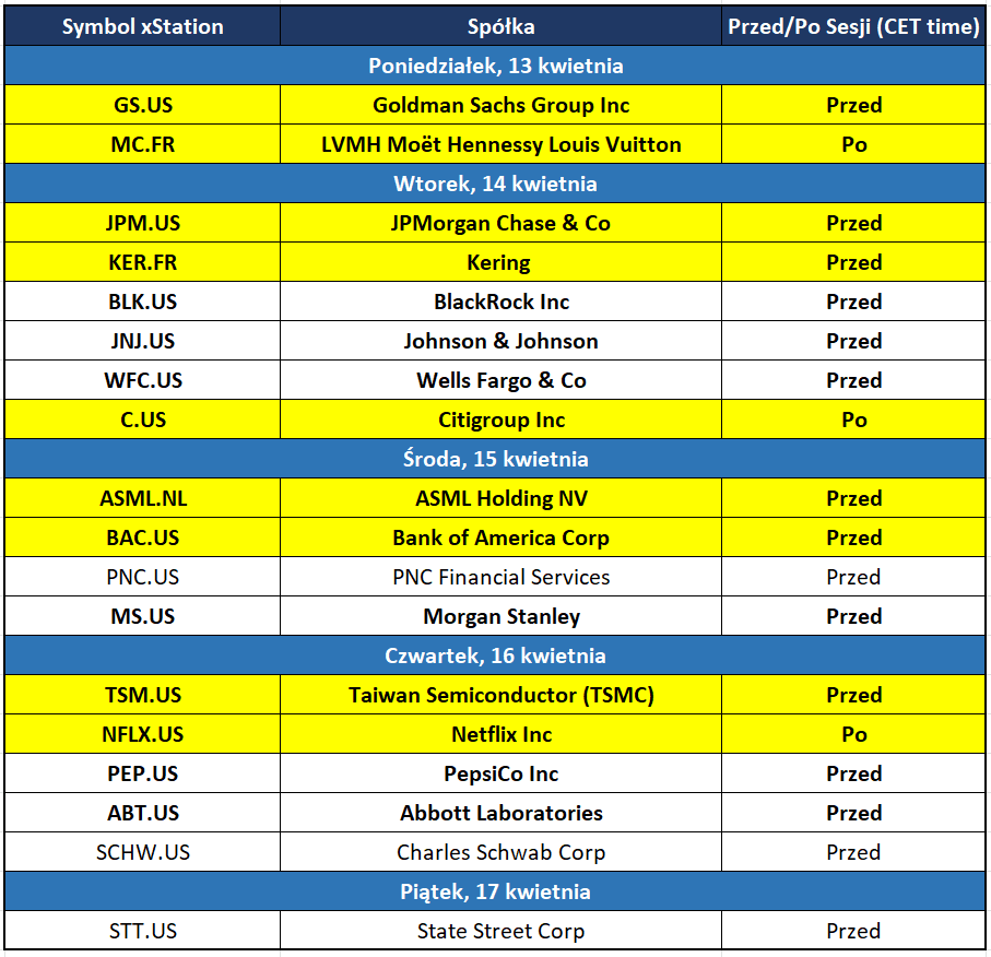 W skali tygodnia najważniejsze będą trzy rzeczy: rozwój sytuacji wokół Iranu, początek sezonu wyników za Q1 oraz dane makro z USA i Europy, które mogą potwierdzić albo osłabić wpływ droższej ropy na inflację. Na liście publikacji są m.in. CPI z Polski, PPI z USA, dane o sprzedaży domów, EBC Minutes, inflacja HICP ze strefy euro oraz odczyty z Chin, więc rynek będzie jednocześnie grał geopolitykę, inflację i perspektywy dla wzrostu. Szczególną uwagę przyciągną banki, LVMH, ASML, TSMC i Netflix, bo ich wyniki dadzą pierwszy sygnał, jak firmy radzą sobie na starcie sezonu raportowego.