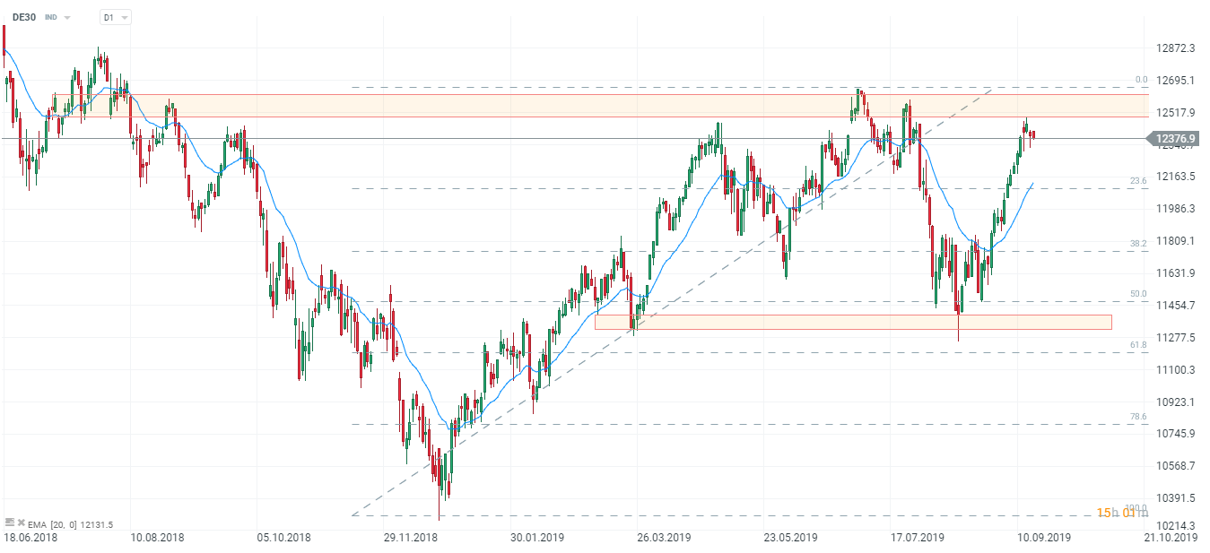 Patrząc na wykres w interwale czasowym D1, możemy zauważyć, że niemiecki indeks podjął próbę “ataku” na lipcowe szczyty. Jednakże strona popytowa przegrała tę walkę i DAX nie zdołał przebić się przez ten fundamentalny opór. Uwzględniając fakt, że nastrój na rynku wydaje się dość ponury, istnieje spore prawdopodobieństwo, że następnym poziomem na którym indeks będzie mógł szukać silnego wsparcia, to pułap 12100 punktów, który jest zarazem 23,6% zniesienia Fibo, a także aktualnym położeniem 20 dniowej średniej kroczącej. Źródło: xStation5
