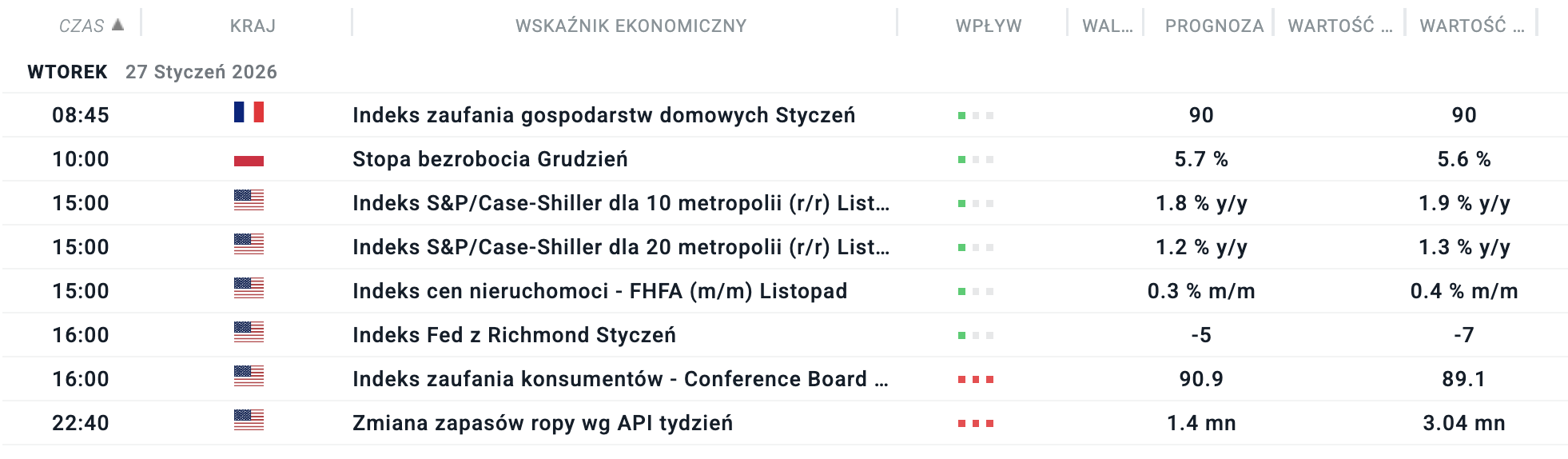 Kalendarz filtrowany po: USA, Strefa Euro, Francja, Niemcy, Polska. Źródło: xStation5