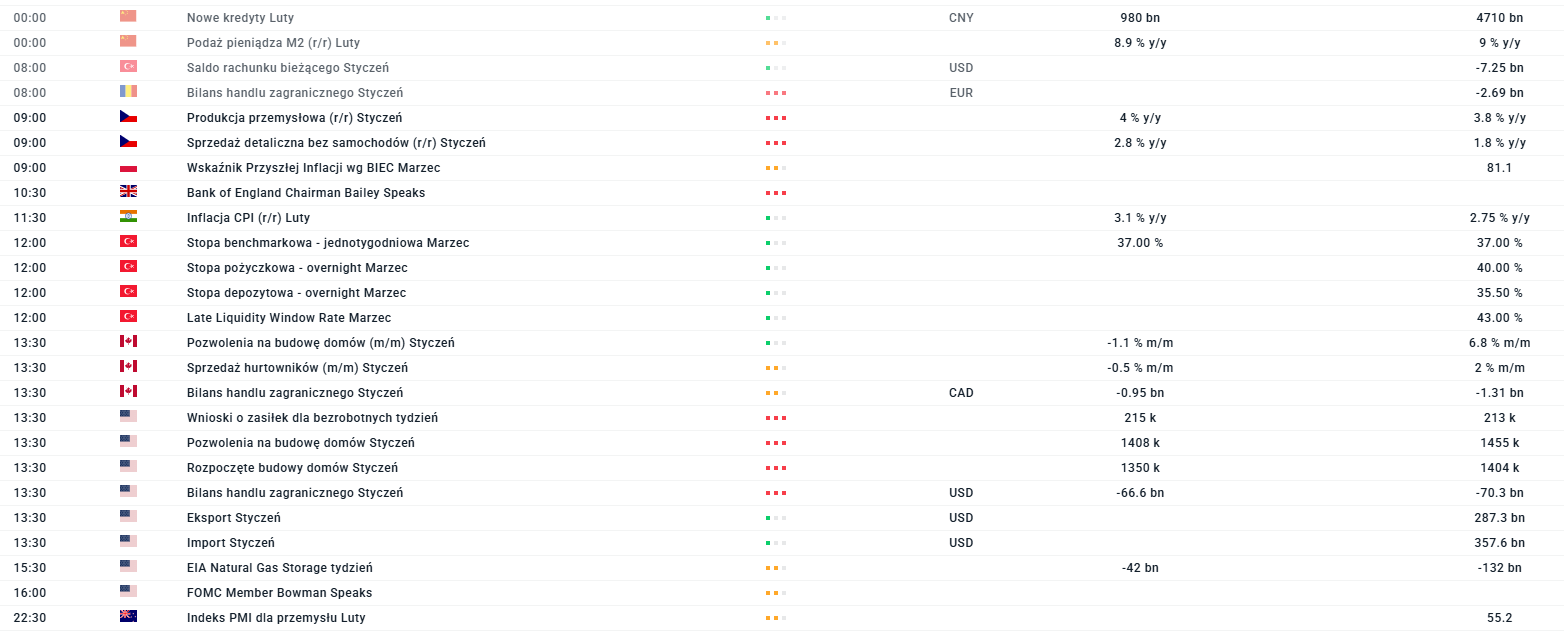 Dziś inwestorzy będą szczególnie uważnie śledzić wnioski o zasiłek dla bezrobotnych w USA, które w połączeniu z wczorajszym odczytem CPI i jutrzejszym raportem PCE dadzą pełniejszy obraz kondycji rynku pracy i presji inflacyjnej. Stabilne lub spadające wnioski mogą złagodzić obawy o rynek pracy i potencjalnie wpłynąć na oczekiwania dotyczące polityki Fed, natomiast wyższe liczby mogą podsycić oczekiwania dalszych podwyżek stóp. Poza USA, uwaga rynków skierowana jest też na dane z Chin, Turcji, Czech, Polski, Indii, Kanady i Nowej Zelandii, które pokazują szerszy obraz aktywności gospodarczej i trendów w produkcji, sprzedaży detalicznej i handlu zagranicznym.