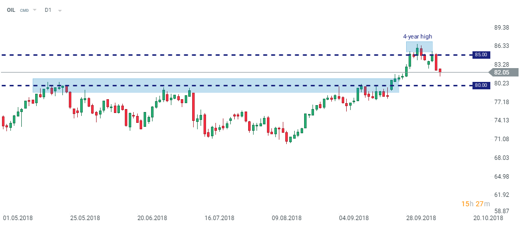 Kombinacja wielu czynników wyraźnie pogorszyła perspektywy dla ropy w ostatnich kilku dniach. Chociaż dane dotyczące zapasów ropy nie zmienią tego trendu, to mogłyby złagodzić ruch spadkowy. Około dziewiątej ropa Brent znajdowała się nieco powyżej poziomu 82 dolarów. Źródło: xStation5.