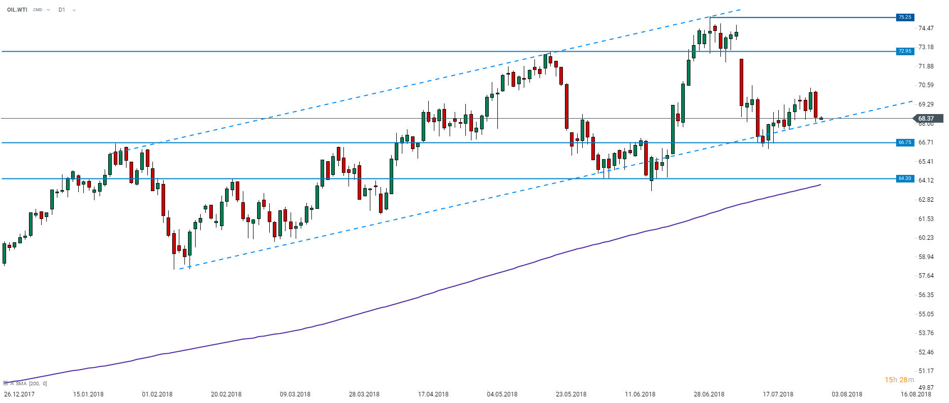 Plotki o tym, że Donald Trump może podsycać ogień przez podnoszenie taryf celnych powodują, że dane mogą wydawać się drugorzędne. Niemniej jednak bezpośredni wpływ danych makroekonomicznych na ceny jest niekwestionowany. Przez cały dzień będą publikowane finalne odczyty PMI za czerwiec, ale finalne publikacje rzadko kiedy mocno wpływają na rynek. Poza tym inwestorzy będą mogli się dzisiaj przyglądać cotygodniowej dawce informacji od DOE, a także dzisiejszej decyzji FOMC. Zaplanowany na dzisiaj (tj. o godzinie 14:15) jest także raport ADP o zmianie zatrudnienia w Stanach Zjednoczonych, który może być wskazówką przed piątkowym raportem NFP (oczekuje się wzrostu zatrudnienia o 186 tysięcy).