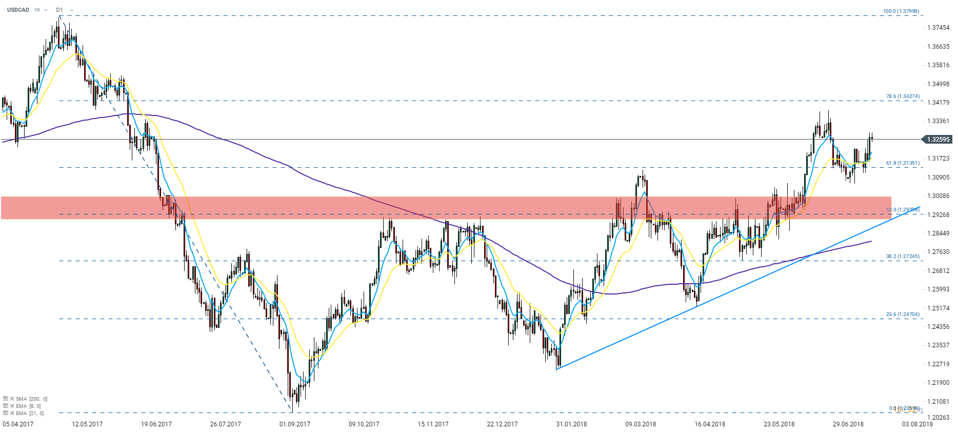 14:30 - Sprzedaż detaliczna i inflacja CPI z Kanady: Bank Kanady zdecydował się na podniesienie stóp procentowych o 25 punktów bazowych podczas swojego lipcowego posiedzenia. Kanadyjska polityka monetarna w najbliższym okresie będzie prawdopodobnie zależała od przyszłych decyzji Fedu, jako że te dwa banki centralne poruszają się w tandemie. Co ciekawe, podczas gdy rynek oczekuje od Fedu jeszcze dwóch podwyżek stóp procentowych w tym roku, nie oczekuje się żadnej kolejnej podwyżki od Banku Kanady. Zgodnie ze zdaniem ekonomistów ankietowanych przez Bloomberga, główny odczyt powinien prawdopodobnie wzrosnąć z 2,2% r/r w maju do 2,4% r/r w czerwcu, podczas gdy oczekuje się, że odczyt bazowy wzrośnie z 1,3% r/r do 1,4% r/r. Jednocześnie opublikowany będzie odczyt dotyczący sprzedaży detalicznej, który prawdopodobnie osiągnie 1% m/m.