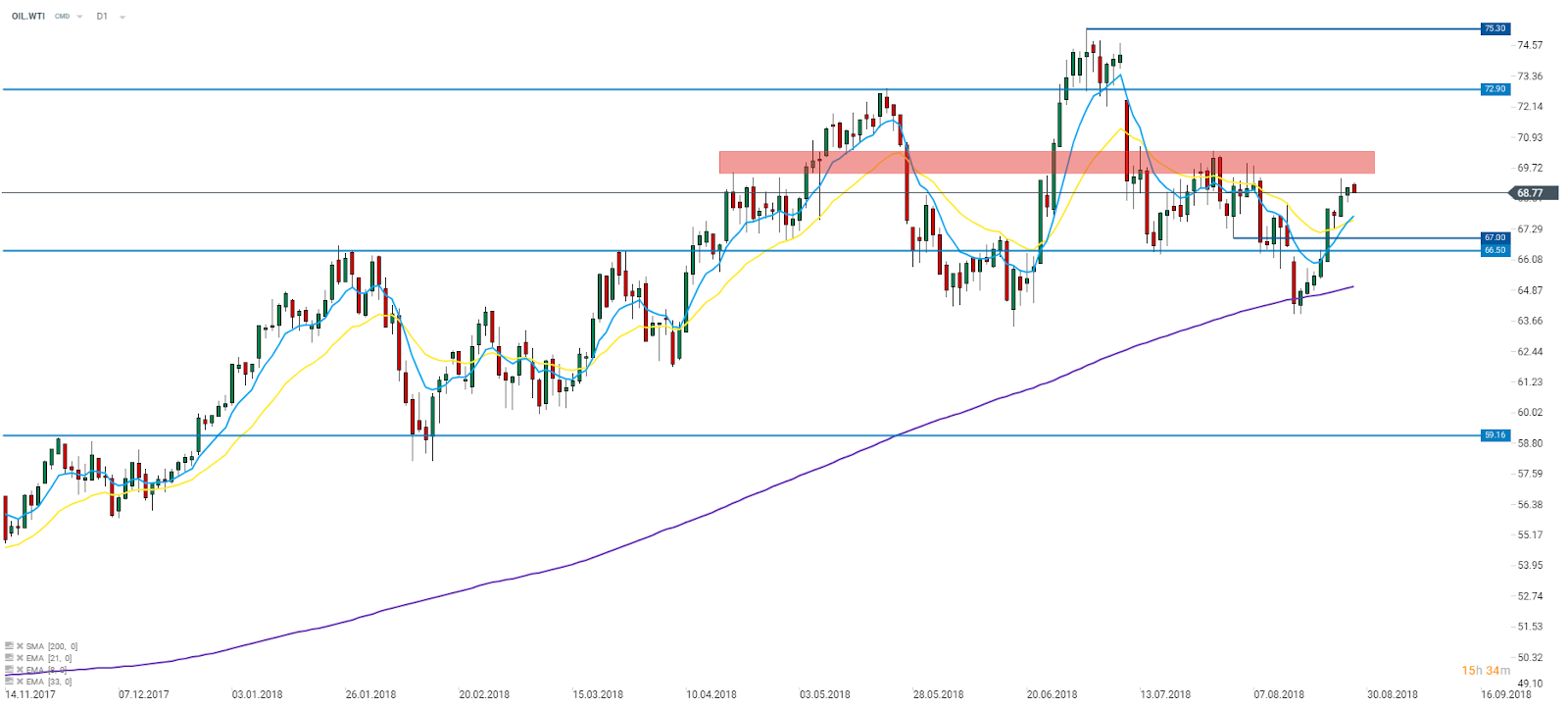 OIL.WTI zbliża się do strefy oporu w zakresie od 69,50 dolara do 70,40 dolara, która stanowiła już istotny poziom w tym roku. Dane dotyczące zapasów ropy naftowej mogą nadać ton reakcji na wspomnianą strefę podażową. Źródło: xStation5