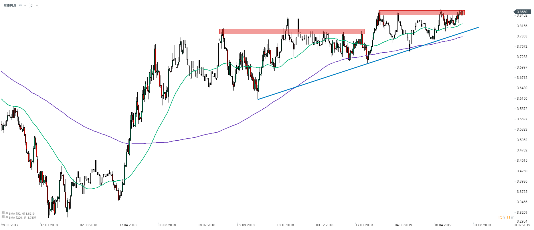 Para USDPLN ponownie dotarła do strefy oporu 3,8450-3,8600. Będzie to już czwarty test tej strefy w tym roku, co zwiększa szanse na wybicie. W przypadku niepowodzenia wsparciem może być 50-sesyjna średnia krocząca i linia trendu wzrostowego. Źródło: xStation5