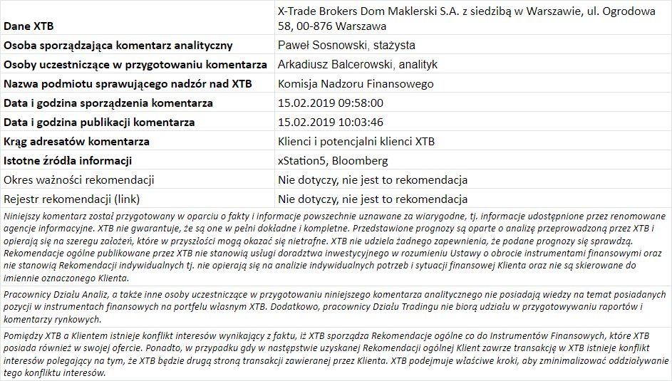 15:15 - Produkcja przemysłowa za styczeń (USA): Po południu uwagę inwestorów może przyciągać publikacja dotycząca produkcji przemysłowej za styczeń ze Stanów Zjednoczonych. Podczas, gdy Brexit gromadzi uwagę na Wyspach, w Stanach króluje temat wojen handlowych. Ostatnie miesiące w sektorze przemysłowym były wyraźnie słabe w wielu rozwiniętych gospodarkach, a dzisiejsze dane mogą potwierdzić albo zanegować, czy gospodarka amerykańska rozpoczęła nowy rok wciąż ze spadkowym trendem. Konsensus rynkowy sugeruje, że wzrost produkcji przemysłowej zwolnił do 0,1% m/m w styczniu.
