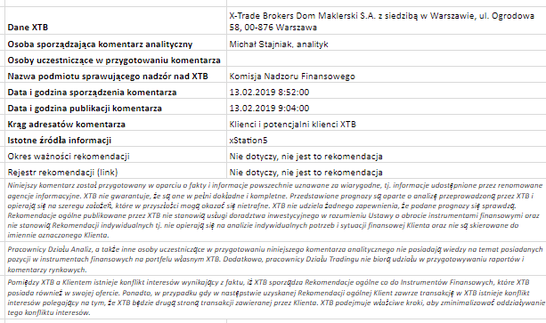 Ta publikacja handlowa jest informacyjna i edukacyjna. Nie jest rekomendacją inwestycyjną ani informacją rekomendującą lub sugerującą strategię inwestycyjną. W materiale nie sugerujemy żadnej strategii inwestycyjnej ani nie świadczymy usługi doradztwa inwestycyjnego. Materiał nie uwzględnia indywidualnej sytuacji finansowej, potrzeb i celów inwestycyjnych klienta. Nie jest też ofertą sprzedaży ani subskrypcji. Nie jest zaproszeniem do nabycia, reklamą ani promocją jakichkolwiek instrumentów finansowych. Publikację handlową przygotowaliśmy starannie i obiektywnie. Przedstawiamy stan faktyczny znany autorom w chwili tworzenia dokumentu. Nie umieszczamy w nim żadnych elementów oceniających. Informacje i badania oparte na historycznych danych lub wynikach oraz prognozy nie stanowią pewnego wskaźnika na przyszłość. Nie odpowiadamy za Twoje działania lub zaniechania, zwłaszcza za to, że zdecydujesz się nabyć lub zbyć instrumenty finansowe na podstawie informacji z tej publikacji handlowej. Nie odpowiadamy też za szkody, które mogą wynikać z bezpośredniego czy też pośredniego wykorzystania tych informacji. Inwestowanie jest ryzykowne. Inwestuj odpowiedzialnie.