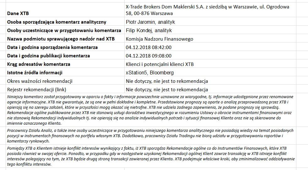 Ta publikacja handlowa jest informacyjna i edukacyjna. Nie jest rekomendacją inwestycyjną ani informacją rekomendującą lub sugerującą strategię inwestycyjną. W materiale nie sugerujemy żadnej strategii inwestycyjnej ani nie świadczymy usługi doradztwa inwestycyjnego. Materiał nie uwzględnia indywidualnej sytuacji finansowej, potrzeb i celów inwestycyjnych klienta. Nie jest też ofertą sprzedaży ani subskrypcji. Nie jest zaproszeniem do nabycia, reklamą ani promocją jakichkolwiek instrumentów finansowych. Publikację handlową przygotowaliśmy starannie i obiektywnie. Przedstawiamy stan faktyczny znany autorom w chwili tworzenia dokumentu. Nie umieszczamy w nim żadnych elementów oceniających. Informacje i badania oparte na historycznych danych lub wynikach oraz prognozy nie stanowią pewnego wskaźnika na przyszłość. Nie odpowiadamy za Twoje działania lub zaniechania, zwłaszcza za to, że zdecydujesz się nabyć lub zbyć instrumenty finansowe na podstawie informacji z tej publikacji handlowej. Nie odpowiadamy też za szkody, które mogą wynikać z bezpośredniego czy też pośredniego wykorzystania tych informacji. Inwestowanie jest ryzykowne. Inwestuj odpowiedzialnie.