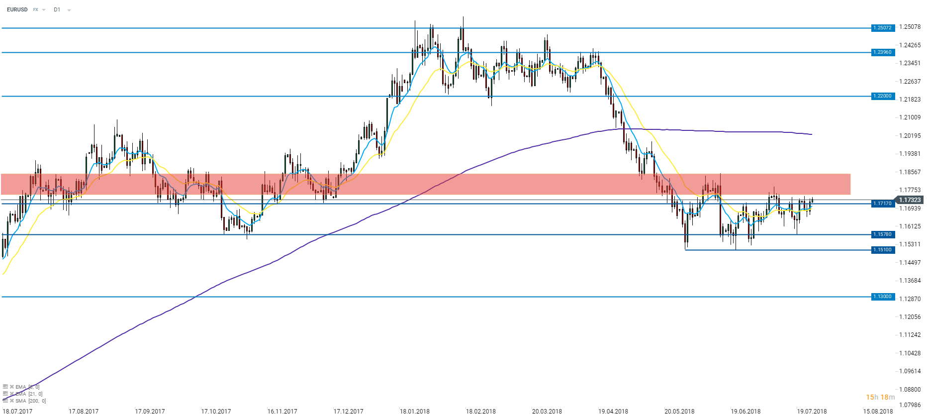 13:45 - Decyzja EBC: Pomimo ogłoszenia końca programu luzowania ilościowego waluta Eurolandu nie odniosła korzyści z ostatniego posiedzenia banku centralnego. Spowodowane to zostało stwierdzeniem banku o utrzymaniu niezmienionych stóp procentowych co najmniej do przyszłego lata. Ostatnie wypowiedzi członków Europejskiego Banku Centralnego sugerują, że podwyżka stóp będzie zależała od nadchodzących danych. Mając to na uwadze, inwestorzy czujnie przyglądać się dzisiaj będą konferencji prasowej o godzinie 14:30, żeby zobaczyć, czy Mario Draghi odniesie się do opublikowanych dwa dni temu najnowszych europejskich odczytów PMI.
