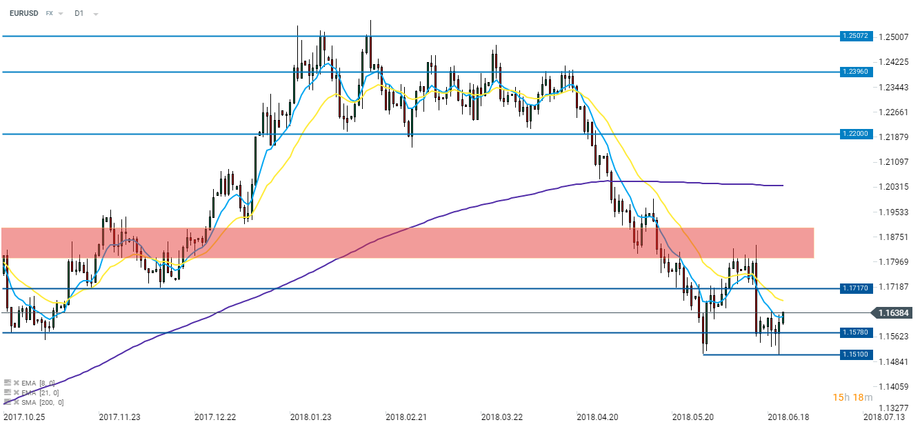 Euro wciąż walczy o odbicie w stosunku do dolara amerykańskiego. Na razie kurs utrzymuje się powyżej wsparcia na 1,1578. Niemniej jednak należy mieć na uwadze, że w przypadku braku zdecydowanej reakcji kupujących może dojść do ponownego testu. Spadek poniżej 1,1510 może doprowadzić do kontynuacji wyprzedaży euro. Źródło: xStation5