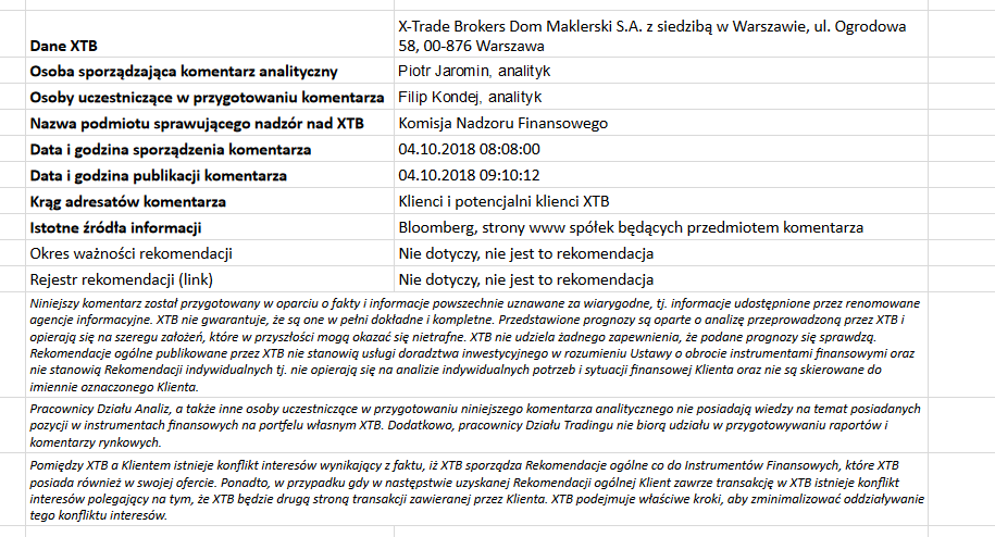 Ta publikacja handlowa jest informacyjna i edukacyjna. Nie jest rekomendacją inwestycyjną ani informacją rekomendującą lub sugerującą strategię inwestycyjną. W materiale nie sugerujemy żadnej strategii inwestycyjnej ani nie świadczymy usługi doradztwa inwestycyjnego. Materiał nie uwzględnia indywidualnej sytuacji finansowej, potrzeb i celów inwestycyjnych klienta. Nie jest też ofertą sprzedaży ani subskrypcji. Nie jest zaproszeniem do nabycia, reklamą ani promocją jakichkolwiek instrumentów finansowych. Publikację handlową przygotowaliśmy starannie i obiektywnie. Przedstawiamy stan faktyczny znany autorom w chwili tworzenia dokumentu. Nie umieszczamy w nim żadnych elementów oceniających. Informacje i badania oparte na historycznych danych lub wynikach oraz prognozy nie stanowią pewnego wskaźnika na przyszłość. Nie odpowiadamy za Twoje działania lub zaniechania, zwłaszcza za to, że zdecydujesz się nabyć lub zbyć instrumenty finansowe na podstawie informacji z tej publikacji handlowej. Nie odpowiadamy też za szkody, które mogą wynikać z bezpośredniego czy też pośredniego wykorzystania tych informacji. Inwestowanie jest ryzykowne. Inwestuj odpowiedzialnie.