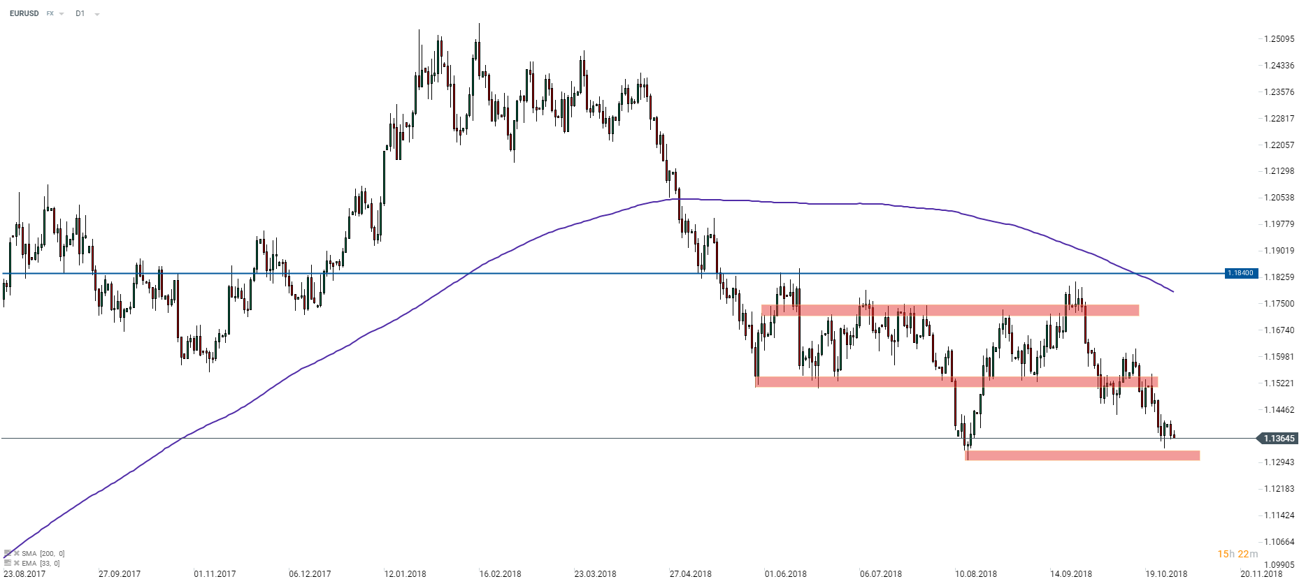 11:00 Strefa euro –PKB za III kwartał. Dane dotyczące wzrostu za III kwartał z USA okazały się być lepsze od rynkowych oczekiwań, co pokazuje siłę amerykańskiej gospodarki. Niestety w przypadku Europy może być nieco słabiej. Sporo zawirowań politycznych, problemy migracyjne, wojny handlowe powodują słabszy wzrost ze strony europejskich gospodarek. Co ciekawe, EBC zamierza zakończyć program QE, co może stanowić cios dla polityki wzrostowej w Europie. Większe rozczarowanie mogłoby pociągnąć europejską walutę jeszcze niżej.