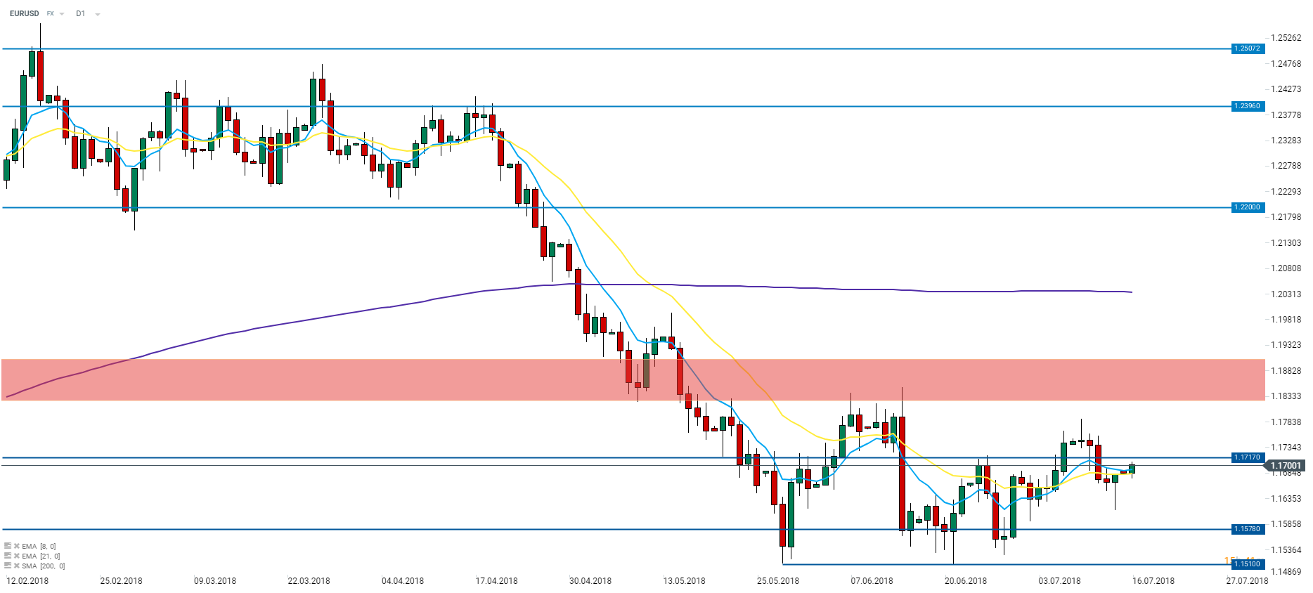 EURUSD cały czas pozostaje w konsolidacji pomiędzy 1,1510 i 1,1810. Uwaga inwestorów z pewnościa skupi się dziś na danych o sprzedaży detalicznej za czerwiec. Źródło: xStation5.
