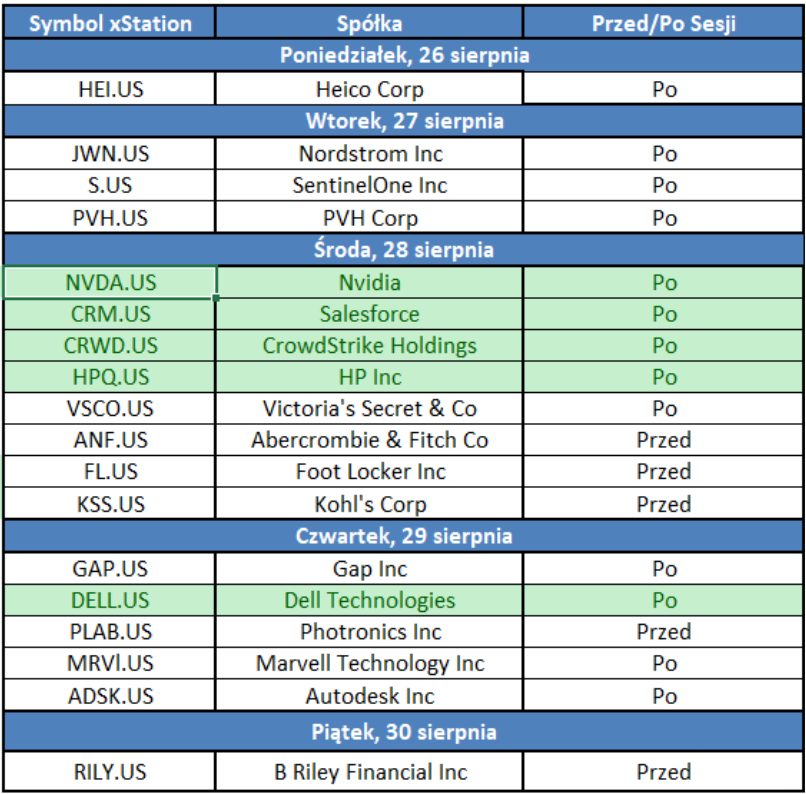 Przed nami kluczowe dane kwartalne Nvidii, spółki dla wielu stawianej jak lider gorączki AI. Oprócz napływających danych makro, to właśnie reakcja na wyniki spółki może zadecydować o nastrojach inwestorów w przyszłym tygodniu. W tle znajdują się również wyniki innych spółek technologicznych oraz tych ściśle powiązanych z popytem konsumentów.