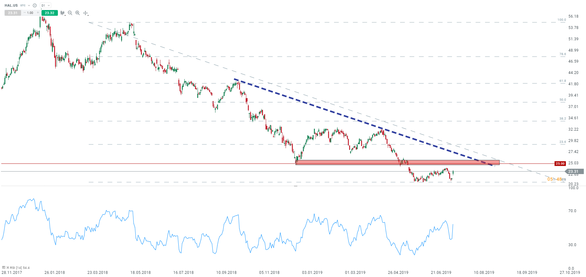 Halliburton odbija dzisiaj o ponad 7%, odbijając się z okolic wieloletnich dołków. Bardzo silny opór dla ceny znajduje się przy poziomie 25 USD za akcję. Źródło: xStation5
