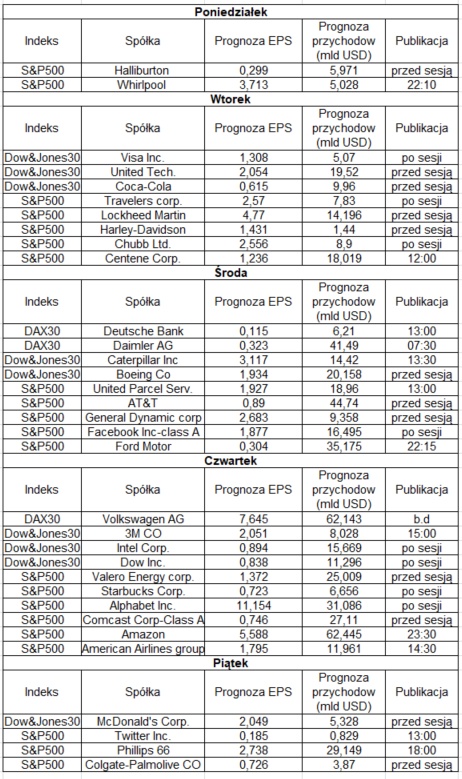 W tym tygodniu nie brakuje publikacji wielkich gigantów, m.in. takich spółek jak Coca-Cola, Caterpillar czy Amazon. Źródło: Bloomberg, XTB
