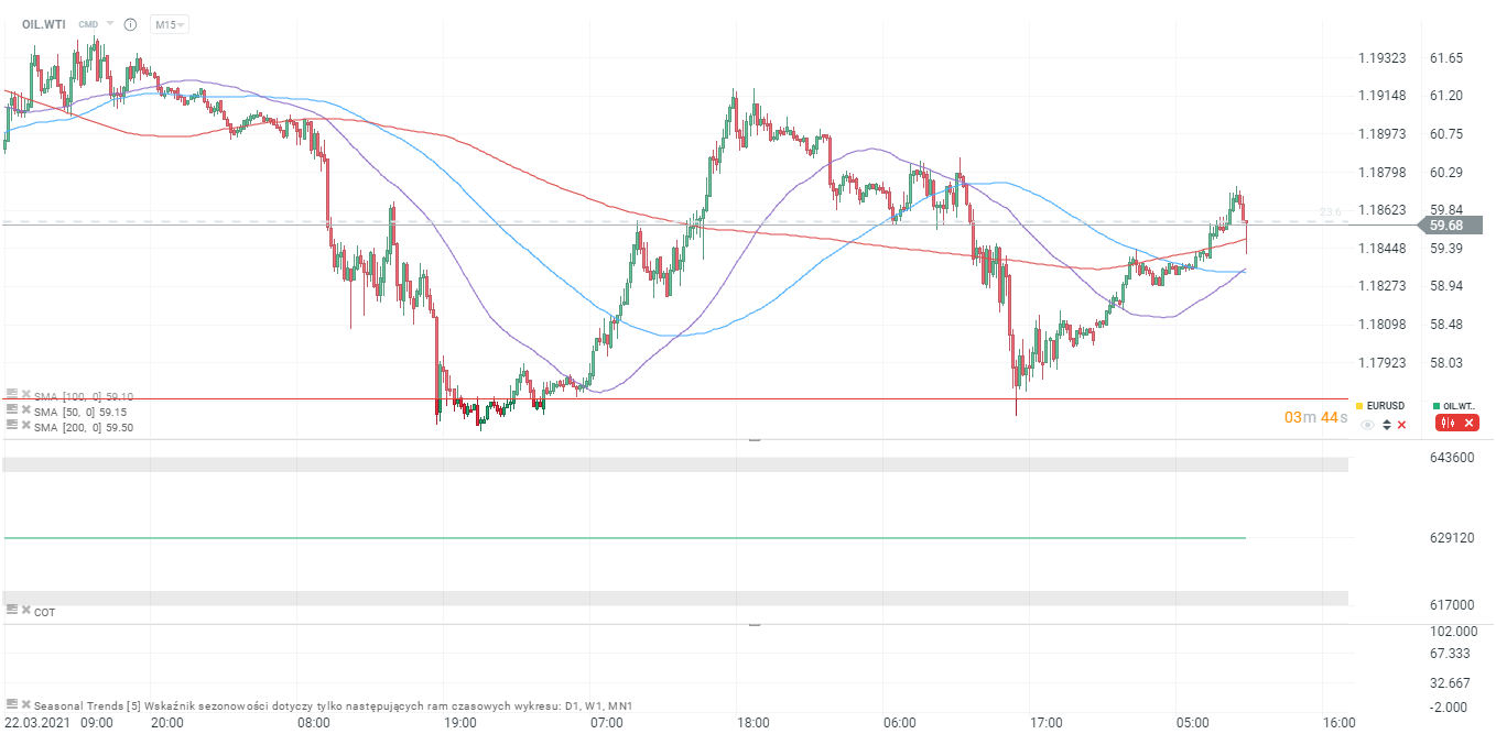 Tymczasem ropa WTI po porannych wzrostach zaliczyła lekką korektę po dojściu w okolice poziomu 60 dolarów za baryłkę. Cena reaguję jednak blisko poziomu 59 dolarów za baryłkę, gdzie zawiązuje się pozytywny sygnał przecięcia średnich na M15. Źródło: xStation5
