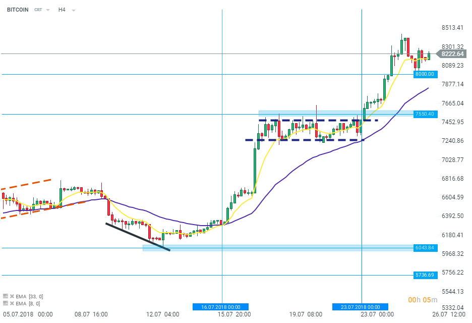 Bitcoin (BITCOIN na xStation5) porusza się nieco powyżej poziomu 8200 dolarów
