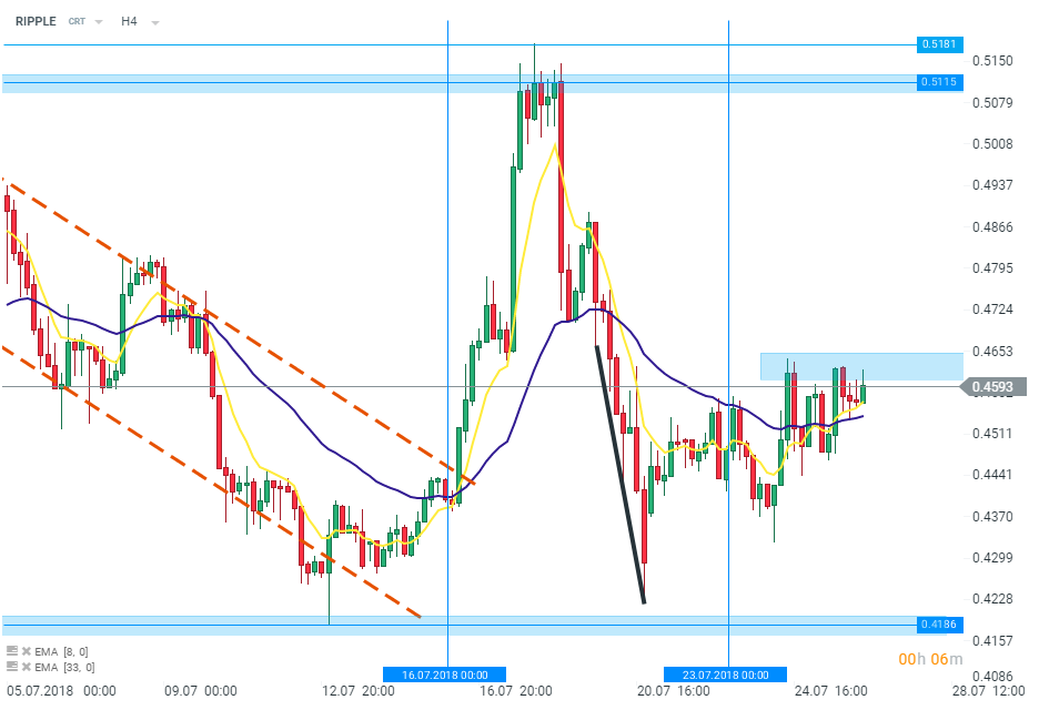 RIPPLE w przeciwieństwie do Bitcoina nie osiągnęło w tym tygodniu spektakularnych zysków. Generalnie wirtualna waluta nie jest zbyt zmienna od początku tygodnia. Obecnie RIPPLE próbuje przebić się przez poziom oporu w okolicach 0,465 dolara. Moneta porusza się powyżej 8- i 33-okresowych średnich kroczących na wykresie H4 (żółta i fioletowa linia). Wyraźne przełamanie poziomu oporu (niebieski prostokąt) może skutkować dłuższymi ruchami wzrostowymi. Źródło: xStation5