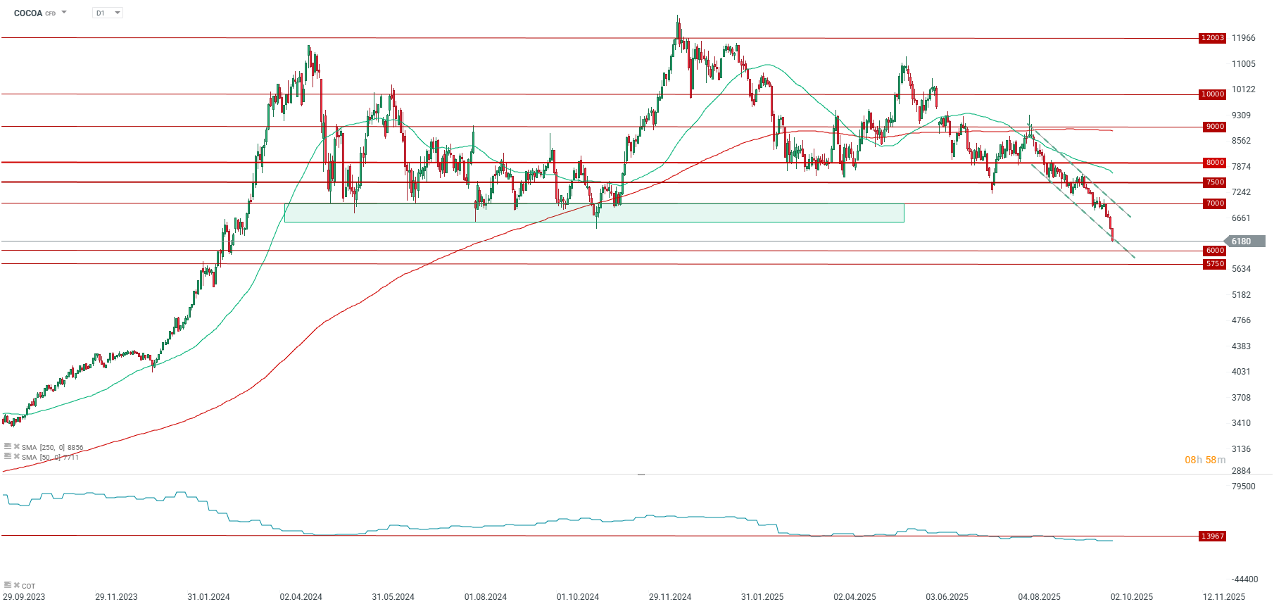Ceny kakao jeszcze na początku tygodnia testowały 7000 USD za tonę, natomiast teraz zbliżają się do poziomu 6000 USD. Źródło: xStation5
