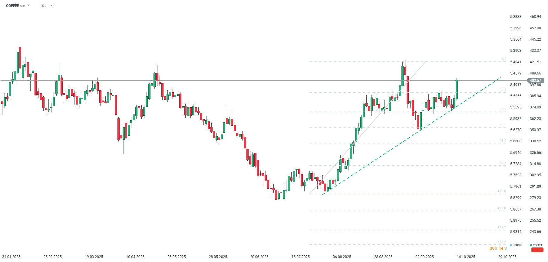 Kawa zyskuje dzisiaj niemal 5%, przekraczając poziom 400 centów, pierwszy raz od 17 września. Silne wzrosty miały miejsce już podczas wczorajszej sesji, motywowane obawami dotyczącymi małej ilości opadów w Brazylii, które w kluczowym okresie kwitnięcia drzewek mogą spowodować wyraźny spadek perspektyw produkcji w przyszłym sezonie. Warto również zwrócić uwagę na spadek zapasów kawy na ICE do najniższych poziomów od 1,5 roku. Stany Zjednoczone w dalszym ciągu unikają kupowania brazylijskiej kawy ze względu na obowiązywanie 50% ceł. W zeszłym miesiącu NOAA z USA wskazała, że prawdopodobieństwo wystąpienia silnego zjawiska La Nina wzrosło do 71%. Zjawisko to w najbliższych miesiącach może spowodować susze w Brazylii, które w jeszcze większym stopniu mogą ograniczyć zbiory w przyszłym sezonie Cena Arabiki rośnie dzisiaj o ok. 5%, wybijając opór przy zniesieniu 23.6 ostatniej fali wzrostowej. Silna strefa podażowa znajduje się w zakresie 420-430 centów za funta. Nieco powyżej 430 za funta znajdują się historyczne szczyty zanotowane w lutym.