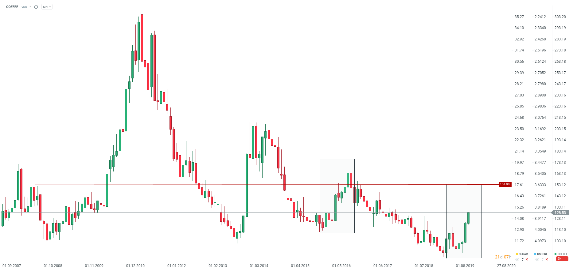 Ceny kawy rosną dzisiaj ponad 4%, znajdując się bardzo blisko poziomu 130 centów za funta, będąc jednocześnie najwyżej od grudnia 2017 roku. Wzrost cen motywowany jest m.in. ostatnim raportem ICO pokazującym ogromny spadek eksportu w październiku oraz deficyt na rynku zarówno w sezonie 18/19 jak i 19/20. Dodatkowo globalne zapasy kawy śledzone przez ICE spadły do najniższych poziomów od 3 lat.