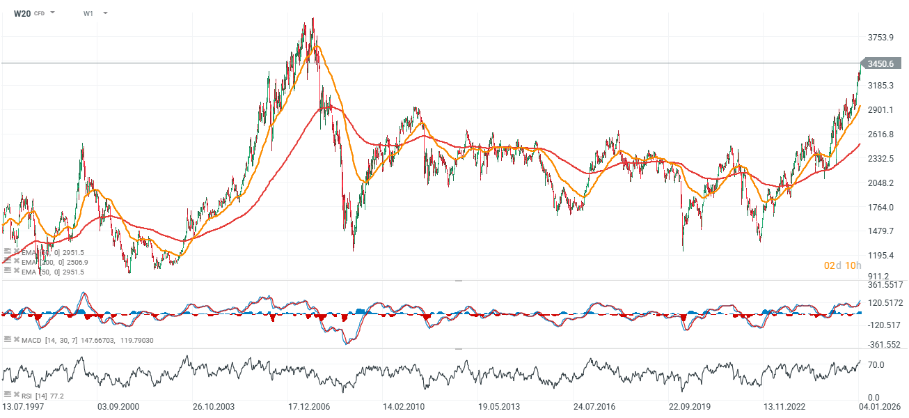 Kontrakty na WIG20 (W20) rosną dziś powyżej 3450 punktów, czyli do poziomów niewidzianych od stycznia 2008 roku. Wskaźnik RSI wzrósł do 77, sugerując poziomy bliskie wykupienia. Na przestrzeni ostatnich 18 lat, indeks trzykrotnie reagował odbiciem z poziomów 1200 punktów.