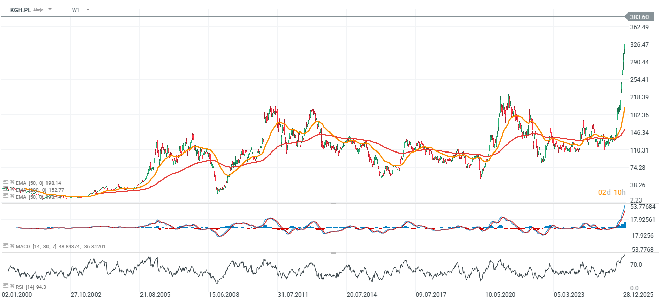 - Od ostatniego, głębokiego spadku z 2022 roku wzrósł o blisko 250%. Aktualnie hossę napędzają m.in. rosnące walory KGHM (KGH.PL). Spółka odnotuje rekordowe zyski dzięki rosnącym cenom srebra i miedzi na globalnych rynkach, co 'popycha' szeroki rynek do 'repricingu' biznesu polskiego giganta rynku metali.