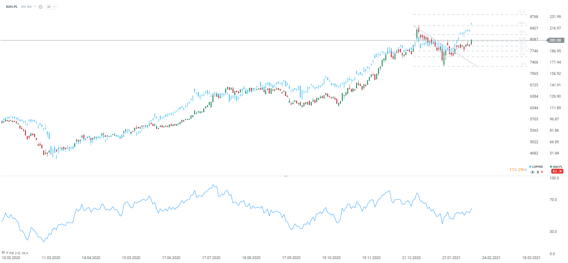 Akcje polskiego miedziowego giganta KGHM powracają powyżej 200 zł, wraz z dalszymi wzrostami cen miedzi. Miedź otwiera się kolejną luką wzrostową z ceną powyżej 8500 dolarów za tonę. Tym samym cena metalu osiąga 9 letnie szczyty. Pod względem cen akcji KGHM, cena testuje obecnie lokalne szczyty z początku lutego oraz zniesienie 61.8 ostatniej dużej korekty cenowej. Zamknięcie powyżej wszystkich wspomnianych poziomów otworzy drogę do historycznych szczytów w okolice 221 zł, które obecnie uzasadnione są przez ceny miedzi. KGHM jest dzisiaj najmocniejszą spółką w indeksie WIG20, zyskując 4,5%.