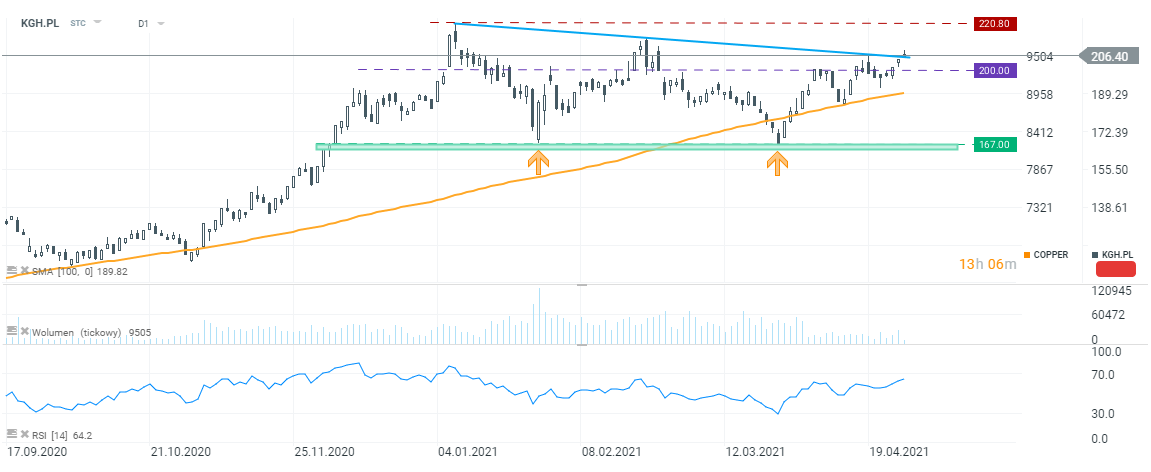 KGHM Polska Miedź (KGH.PL) zyskuje w trakcie dzisiejszej sesji na GPW, znajdująć się już powyżej 200 zł za akcje. Spółka jest beneficjentem zwyżkujących cen miedzi, które wspinają się na wieloletnie szczyty.