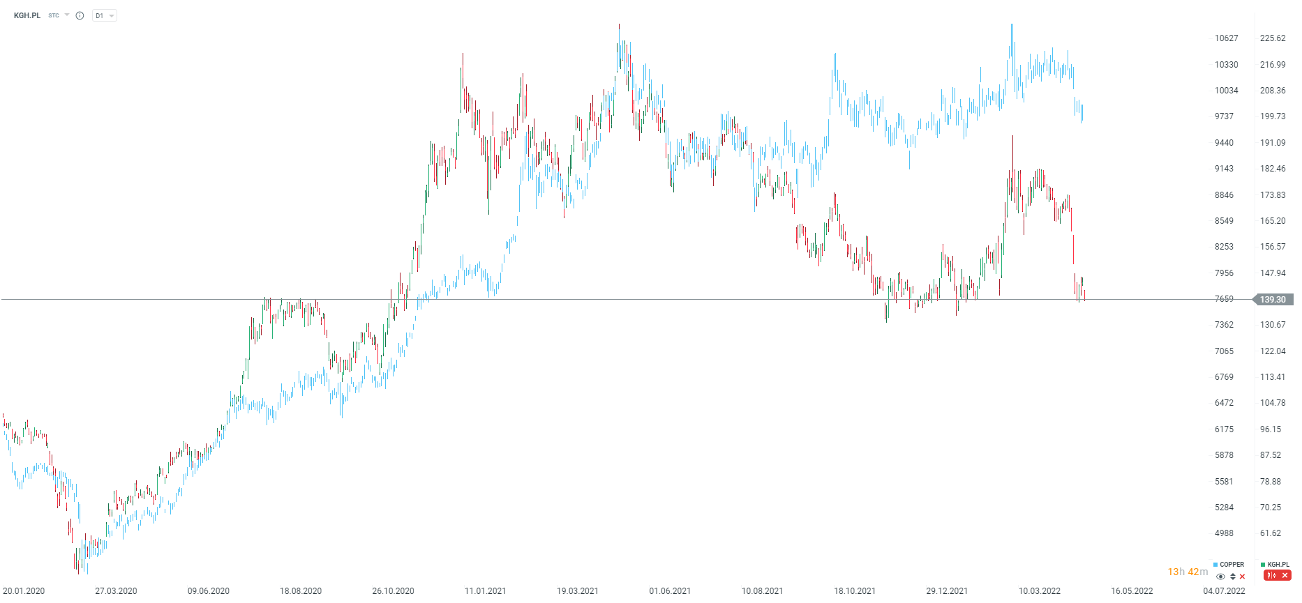 KGHM jest dzisiaj najsłabszą spółką w indeksie WIG20 i traci ok. 3%. Spadki są podyktowane po pierwsze słabymi nastrojami na rynkach oraz spadkiem cen miedzi. KGHM opublikował ostatnio raport produkcyjny, który nie zachwycił biorąc pod uwagę wydobycie w kluczowej inwestycji w Chile, w kopalni Sierra Gorda. Spadek produkcji w ujęciu rocznym wyniósł 16%. Z drugiej strony jak podaje JP Morgam, produkcja ogólnie była większa o 5% w porównaniu do prognoz oraz wydobycie metali w I kwartale pokryło 30% rocznego planu. Spółka opublikuje pełne dane finansowe za Q1 12 maja. JP Morgan utrzymuje neutralne stanowisko dotyczące akcji, natomiast cena docelowa pozostała na poziomie 185 zł za akcje. Akcje obecnie spadły poniżej 140 zł i testują ostatnie lokalne dołki. Kluczowa strefa wsparcia to zakres 130-135 zł.