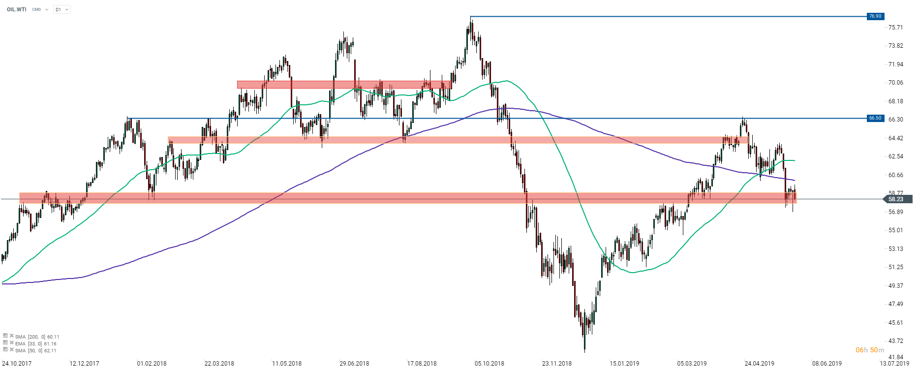 Ropa WTI (OIL.WTI) zdołała zatrzymać ostatni ruch spadkowy na strefie wsparcia rozciągającej się powyżej poziomu 58 USD za baryłkę. Publikacja raportu DOE zachęciła niedźwiedzie do większej aktywność, co przekłada się na mocny spadek cen na wykresie. Zamknięcie się dziennej świeczki, poniżej wspomnianej strefy mogłoby zostać uznane za sygnał ostrzegawczy. Źródło: xStation5