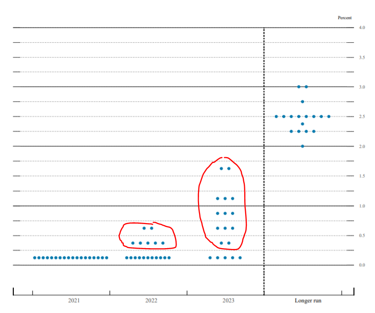Ostatni dot chart pokazywał 7 członków spodziewających się podwyżki w 2022 roku oraz 13 wskazujących na podwyżki w 2013 roku. Te liczby wzrosły z odpowiedni 4 oraz 7. Widać wobec tego, że jest potencjał do dalszych zmian nastrojów wśród bankierów, raczej na plus (choć dane z rynku pracy były mieszane). Jeśli na 2022 przesunie się dodatkowo 3 członków, może to oznaczać, że Fed faktycznie będzie rozważał podwyżki w przyszłym roku.