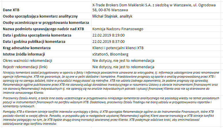 Ta publikacja handlowa jest informacyjna i edukacyjna. Nie jest rekomendacją inwestycyjną ani informacją rekomendującą lub sugerującą strategię inwestycyjną. W materiale nie sugerujemy żadnej strategii inwestycyjnej ani nie świadczymy usługi doradztwa inwestycyjnego. Materiał nie uwzględnia indywidualnej sytuacji finansowej, potrzeb i celów inwestycyjnych klienta. Nie jest też ofertą sprzedaży ani subskrypcji. Nie jest zaproszeniem do nabycia, reklamą ani promocją jakichkolwiek instrumentów finansowych. Publikację handlową przygotowaliśmy starannie i obiektywnie. Przedstawiamy stan faktyczny znany autorom w chwili tworzenia dokumentu. Nie umieszczamy w nim żadnych elementów oceniających. Informacje i badania oparte na historycznych danych lub wynikach oraz prognozy nie stanowią pewnego wskaźnika na przyszłość. Nie odpowiadamy za Twoje działania lub zaniechania, zwłaszcza za to, że zdecydujesz się nabyć lub zbyć instrumenty finansowe na podstawie informacji z tej publikacji handlowej. Nie odpowiadamy też za szkody, które mogą wynikać z bezpośredniego czy też pośredniego wykorzystania tych informacji. Inwestowanie jest ryzykowne. Inwestuj odpowiedzialnie.
