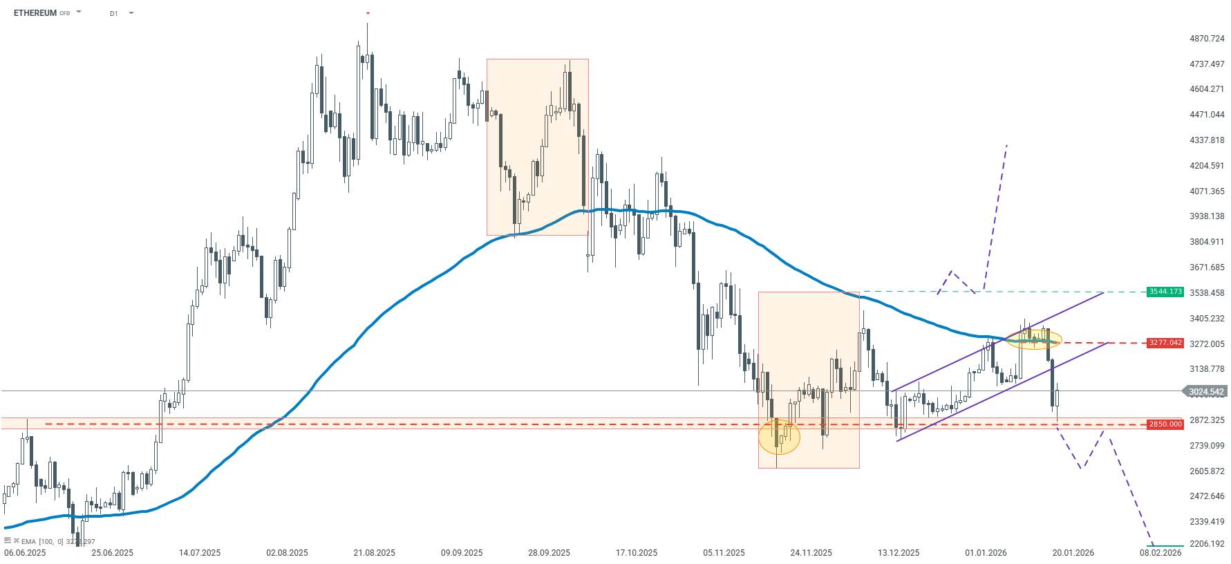 Notowania Ethereum od kilku miesięcy pozostają w trendzie spadkowym, co potwierdza zarówno struktura cenowa, jak i nachylenie średniej kroczącej 100-okresowej. Ostatni impuls spadkowy doprowadził do utworzenia dużej korekty wzrostowej, która została zatrzymana w rejonie średniej EMA100. Cena nieznacznie naruszyła średnią, a następnie pojawiła się silna reakcja podażowa, co potwierdza, że poziom ten pełni obecnie rolę istotnego oporu.