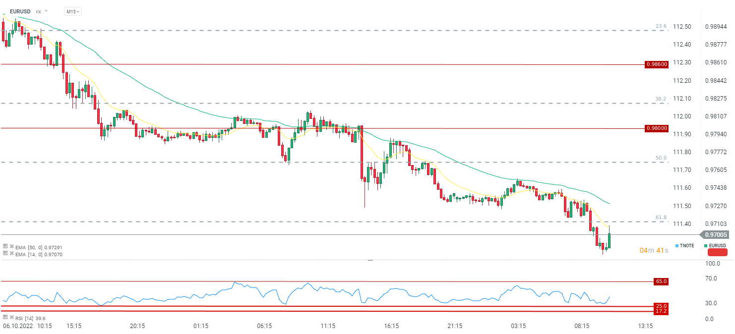 EURUSD próbuje odbijać, wraca powyżej 0,9700, ale napotyka na opór w postaci średniej 14 okresowej. Źródło: xStation5