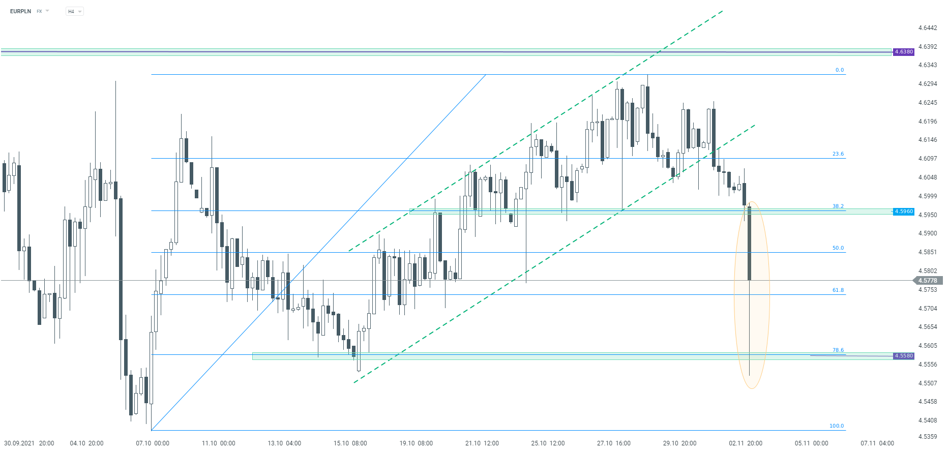 Pierwsza reakcja na złotym jest to oczywiście pozytywna, PLN umacnia się w ujęciu do głównych walut. Patrząc technicznie na EURPLN, notowania zanurkowały po pokonaniu wsparcia przy 4,5960 zł. Ruch spadkowy wyhamował jednak na wysokości strefy przy 4,5580 zł, o której wspominaliśmy podczas porannego webinarium.