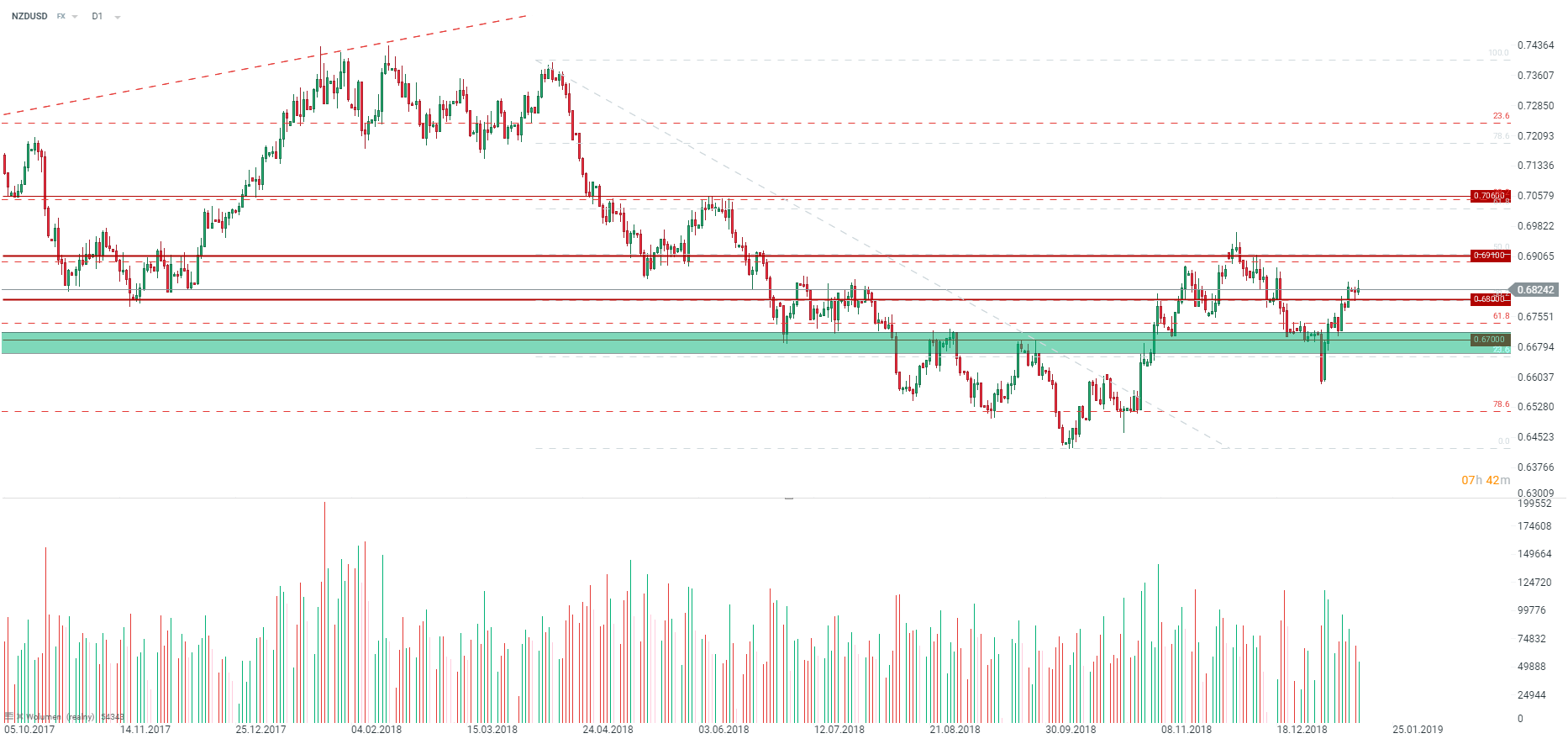 Tymczasem na NZDUSD po realizacji formacji RGR obserwujemy spore odbicie. Dzisiaj jednak widać na parze niepewność. Jeżeli cena zamknie się dzisiaj z tak wyraźnym knotem cenowym, może to oznaczać chęć zejścia niżej. Z drugiej strony poziom 0,6800 jest ważnym wsparciem dla pary. Źródło: xStation5