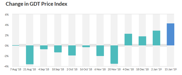 Dzisiaj poznaliśmy wyniki kolejnej aukcji mleka w Nowej Zelandii. Ceny mleka nie odgrywają już dużego znaczenia dla dolara nowozelandzkiego, ale warto przyglądam się również takim wskaźnikom. Warto wspomnieć, że jest to 4 z rzędu aukcja, która pokazała wzrost cen i jednocześnie jest to pierwsza tak duża pozytywna zmiana od wielu miesięcy. Indeks GDT wzrósł o 4,2%, natomiast ceny mleka w proszku zaliczyły wzrost na poziomie 3,0%.