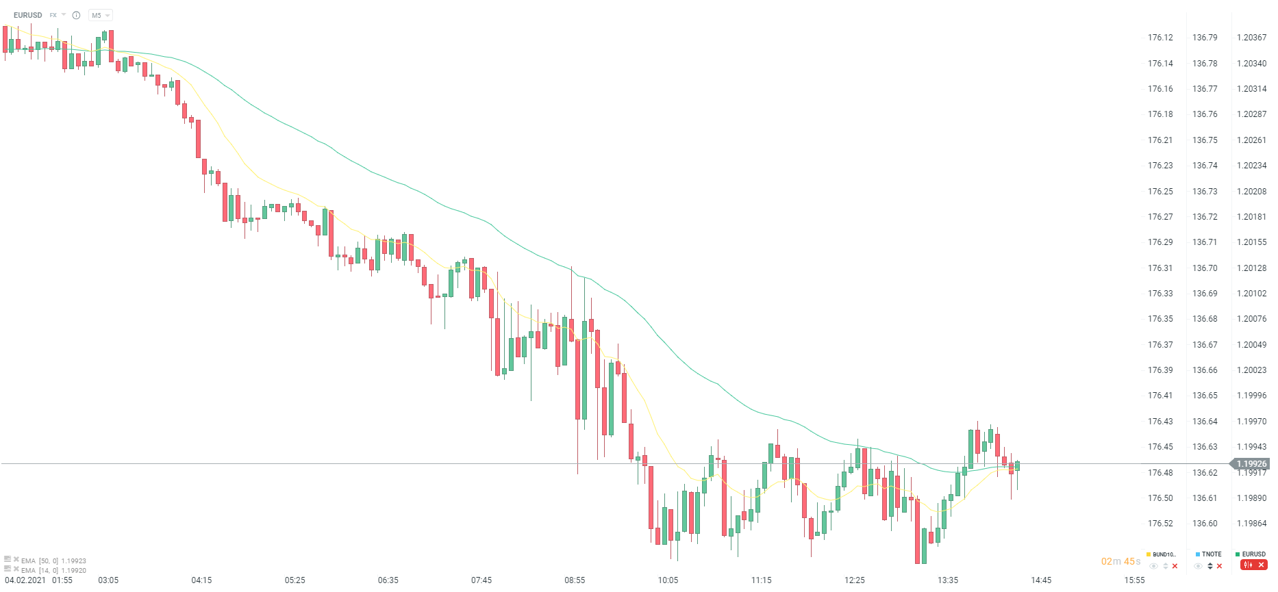 Reakcja na dolarze? W zasadzie żadna, dolar przestał zyskiwać w okolicy 10 i EURUSD wpadł w konsolidację. Po krótkim umocnieniu dolar ponownie zaczyna tracić, ale wciąż jednak znajdujemy się poniżej poziomu 1,20. Źródło: xStation5