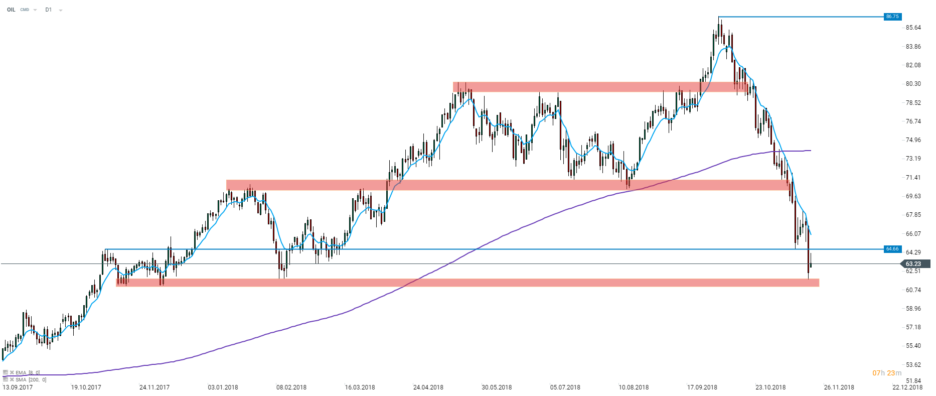Cena ropy dotarła wczoraj do strefy wsparcia 61,05-61,85 USD wyznaczonej przez lokalne dołki z przełomu 2017 i 2018 roku. Kolejny negatywny odczyt danych o zapasach surowca stwarza ryzyko ponownego przetestowania tej strefy. Źródło: xStation5