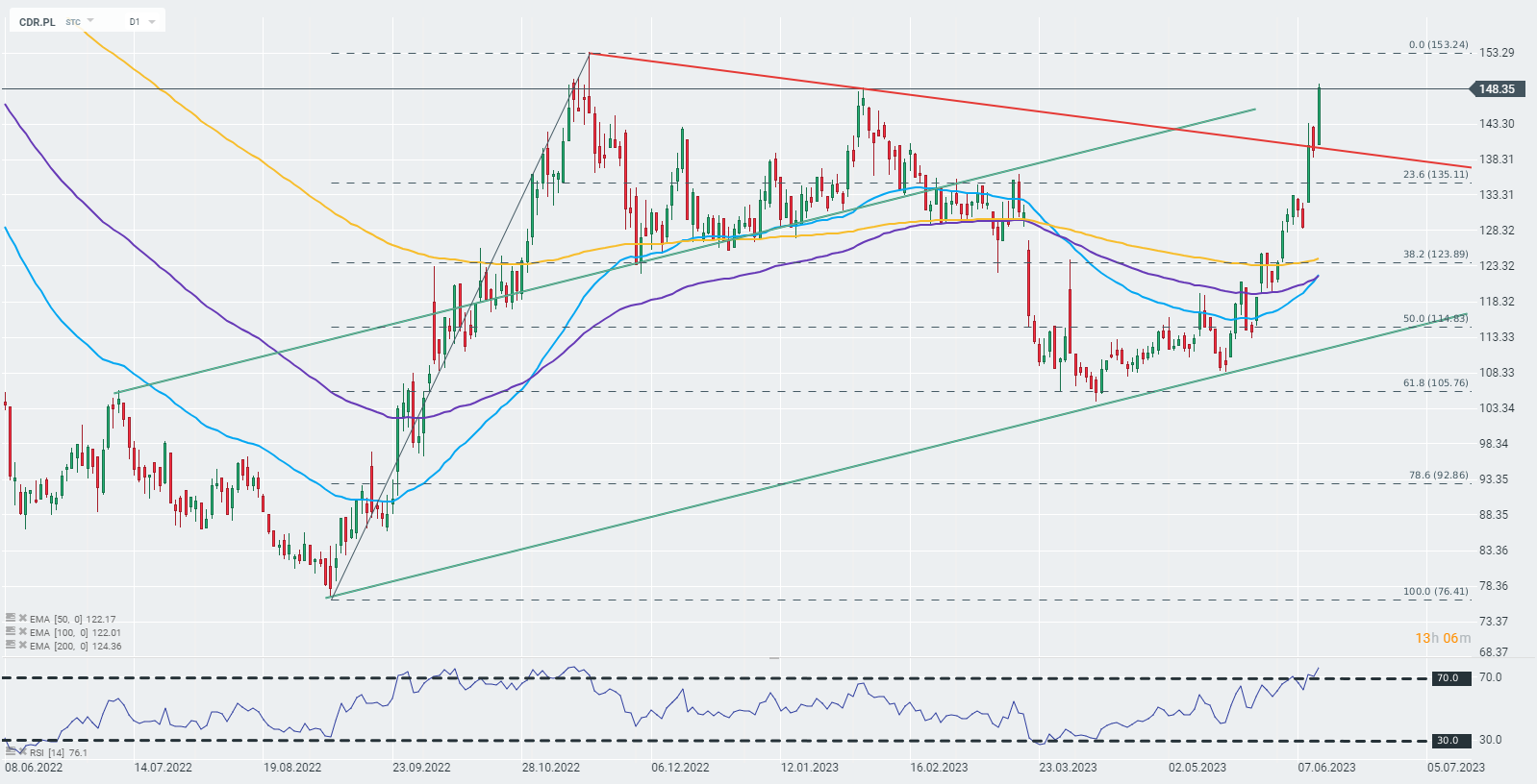 Walory spółki CD Projekt (CDR.PL) testują w chwili obecnej poziomy oporu wyznaczonego przez lokalne maksima z początku lutego 2023 roku. Źródło: xStation 5