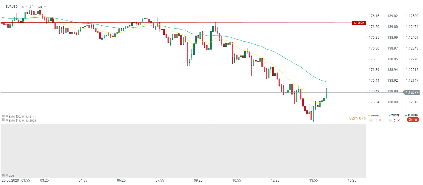 Dolar jest generalnie dzisiaj mocny, ale na dane reaguje raczej negatywnie. Para EURUSD odbija w okolice poziomu 1,1200. Na interwale 5m opór w postaci strefy związanej ze średminimi ruchomymi. Źródło: xStation5