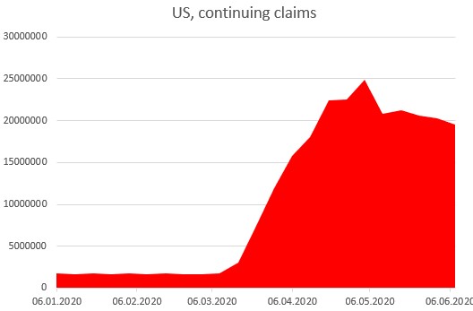 Dzisiaj o godzinie 14:30 upublikowano sporo danych gospodarczych z USA. Przede wszystkim rynek zwraca wciąż uwagę na wnioski o zasiłek dla bezrobotnych, które wypadły na poziomie 1,48 mln wobec oczekiwanych 1,3 mln. Poprzednio wnioski wypadły na poziomie 1,54 mln. Wnioski kontynuowane wypadają lepiej od oczekiwań i spadają do 19,5 mln przy oczekiwaniu 20 mln oraz przy poprzednim poziomie 20,3 mln.